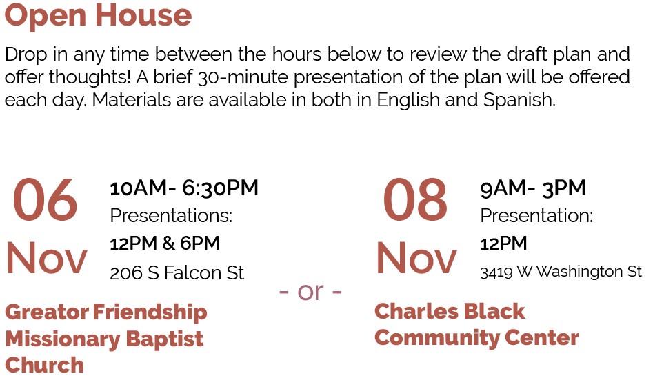 The Neighborhood Plan Draft Document will be available for comment and review during the open house period plan feedback through in person appearances, online feedback, and other engagement opportunities.
